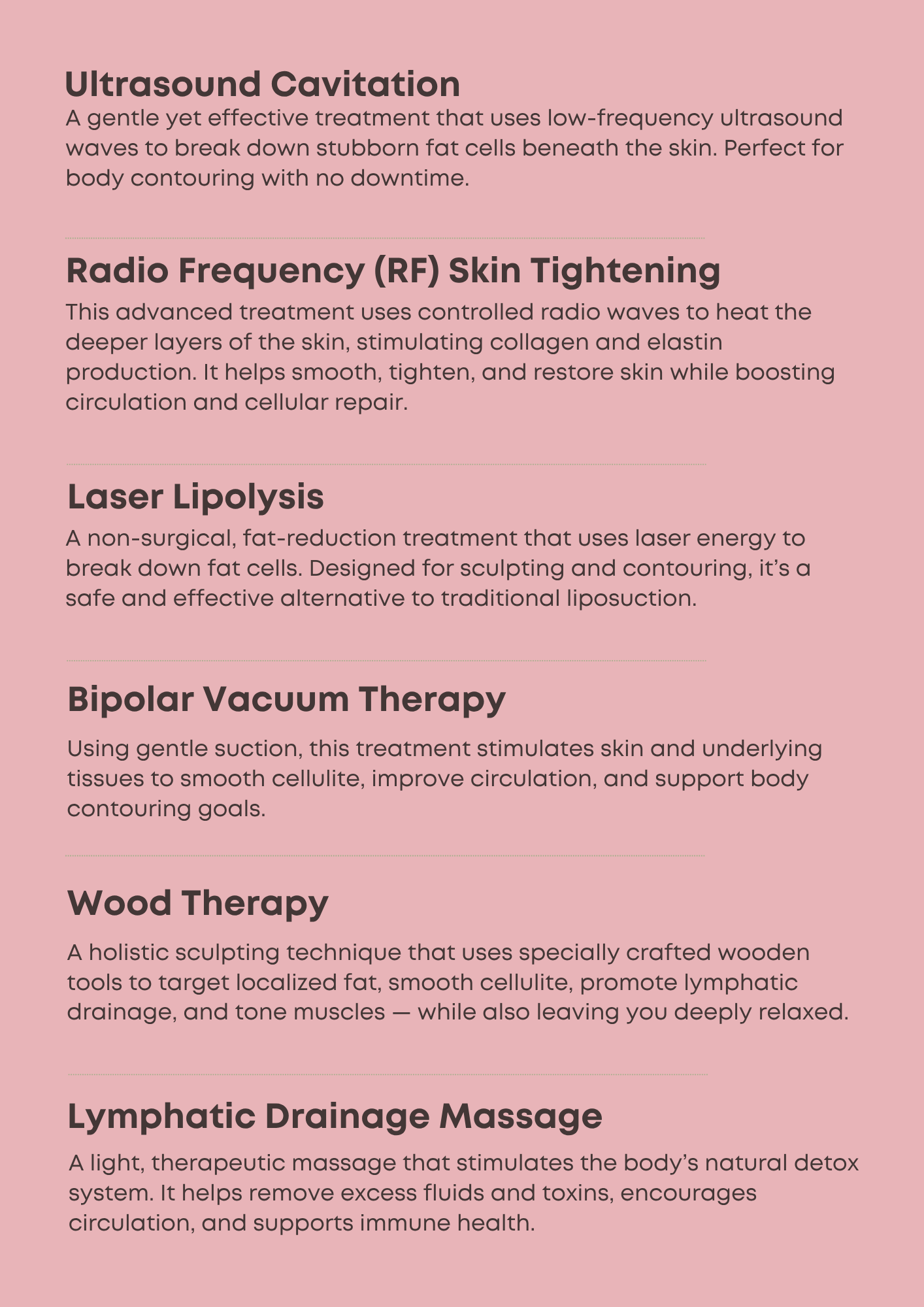 Sculpt your body with precision and care. Our advanced body contouring treatments help you tone, tighten, and define your shape without surgery or downtime.